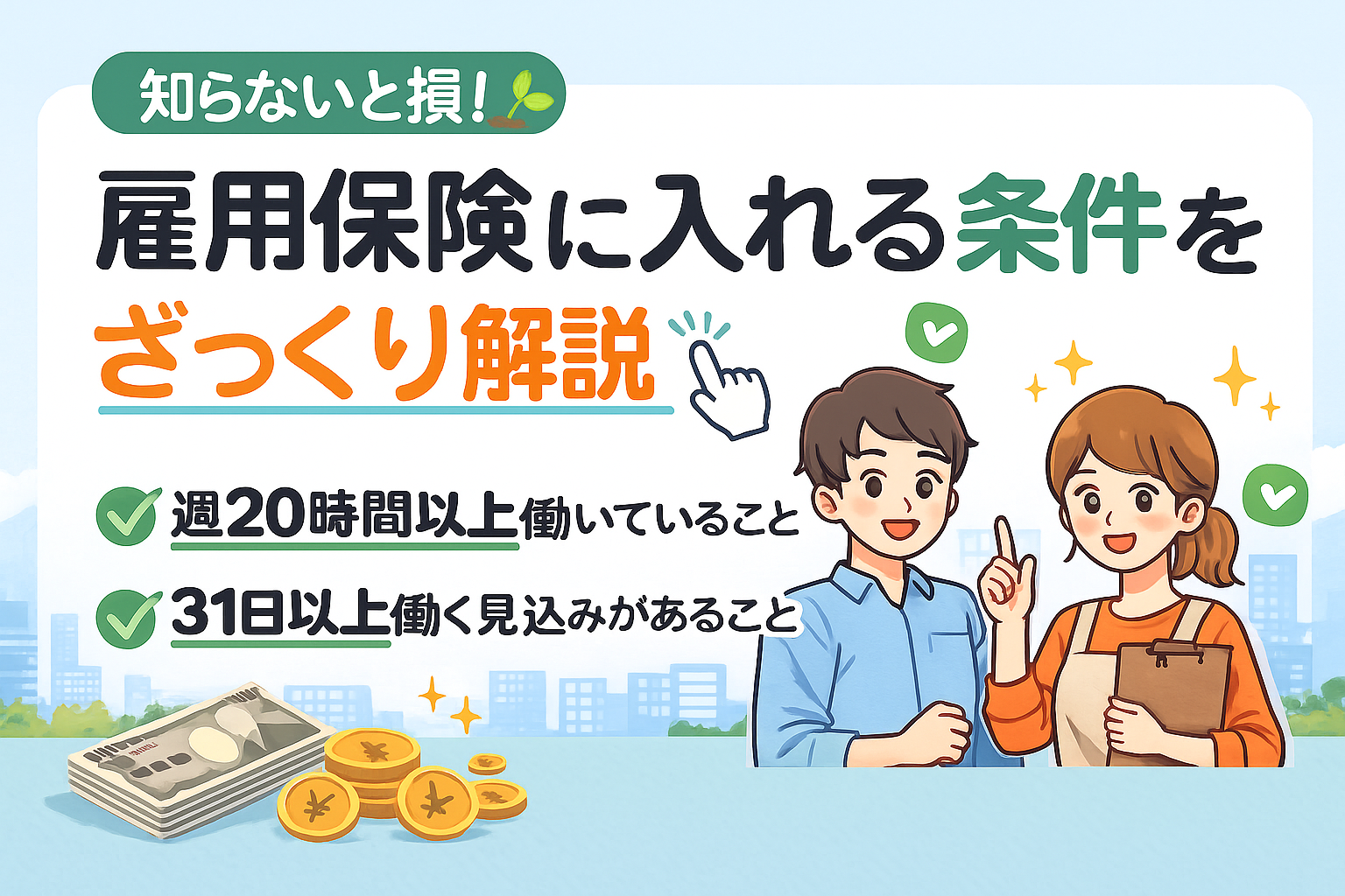 雇用保険の加入条件を初心者向けにやさしく解説。パート・アルバイトでも週20時間以上&31日以上の見込みがあれば加入OK。学生の例外パターンも含め、必要最低限のポイントをわかりやすくまとめています。
